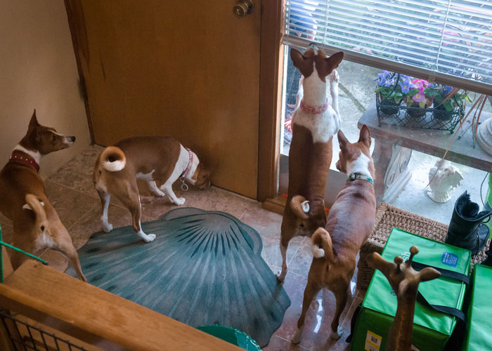 Stranger danger. With Basenjis, you’ll often know if the visitor is friend or foe before you answer the door. Fancier Marian Sweeney describes her dogs’ reaction if the person knocking is an unknown: “After dashing around, they circle in front of the door with hackles up, sniffing and huffing like big silverback gorillas. If one accidentally bumps into another, a major snark and snap session breaks out.” At the home of fancier Catherine Charles, her dogs’ escalating levels of reaction let Catherine know who’s there. The dogs can see the driveway through the big picture-window in the living room, and when someone arrives, three dogs’ heads poke past the sheer curtain panels to assess the situation. Level One--Low: a stranger approaches the front door. The dogs squeak, stand on their hind legs, and scratch and pummel the glass while working their way back and forth on the window. When they take off for the door, they leave the curtain panels fluttering in the wind. Level Two--Medium: a family friend approaches the front door. Reaction similar to above except that the paw action and back-and-forthing on the window pick up speed and the squeaking is augmented by squealing. The curtains are blasted nearly horizontal when the pack speeds to the door.