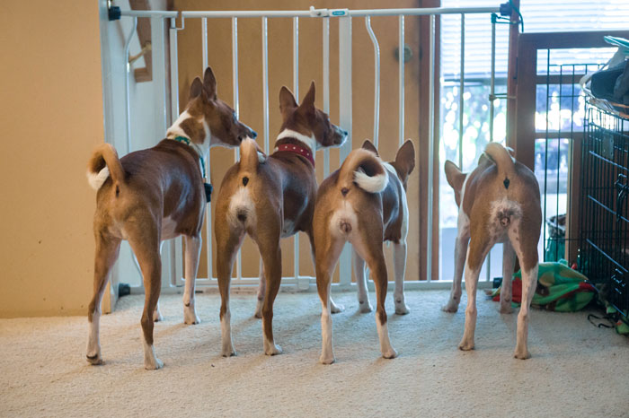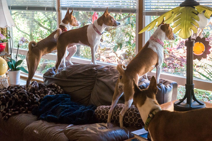 Sometimes physical injury—to the fancier—is a side effect of Basenji security. Brenda Phillips describes a common scene on her living room couch with her bitch Lucy sleeping in her lap and her dog Nike curled next to her: “How do I know someone is at the door?” I can tell from the burning scratches Lucy leaves on my thighs when she takes off at breakneck speed. If that doesn’t do it, the smack to my chin when Nike’s head pops up surely does. Sadly, they don’t distinguish well between a doorbell on television and a doorbell in real life.” Some furniture, because of its location, is not safe for occupancy. Fancier Dave McMahon’s couch serves as a viewing perch for the driveway, so if someone approaches the house, “there’s a mad scramble for the couch, “ said Dave, “and you’ve got five Basenji butts lined up to look out the window.” (Luckily, Basenjis have cute butts, as the breed is known for this type of “window shopping.”) Dave continued, “Then they rotate down—in a kind of staggered dismount—and race to the front door and circle back. It’s a hazardous seating area.”