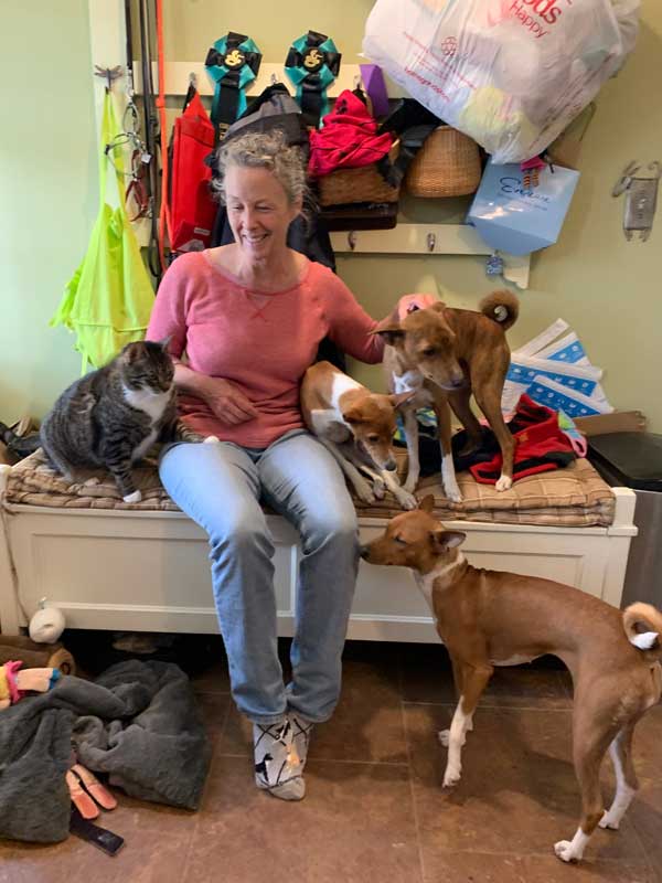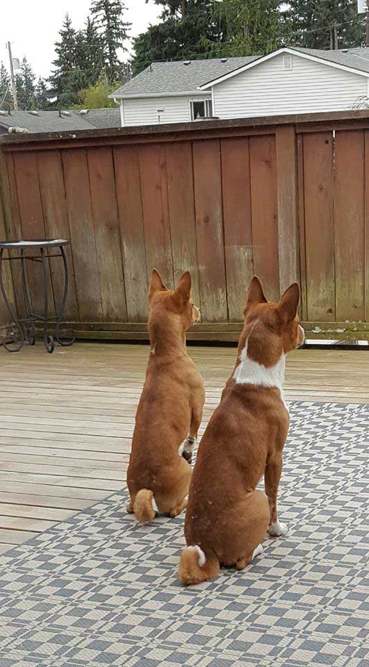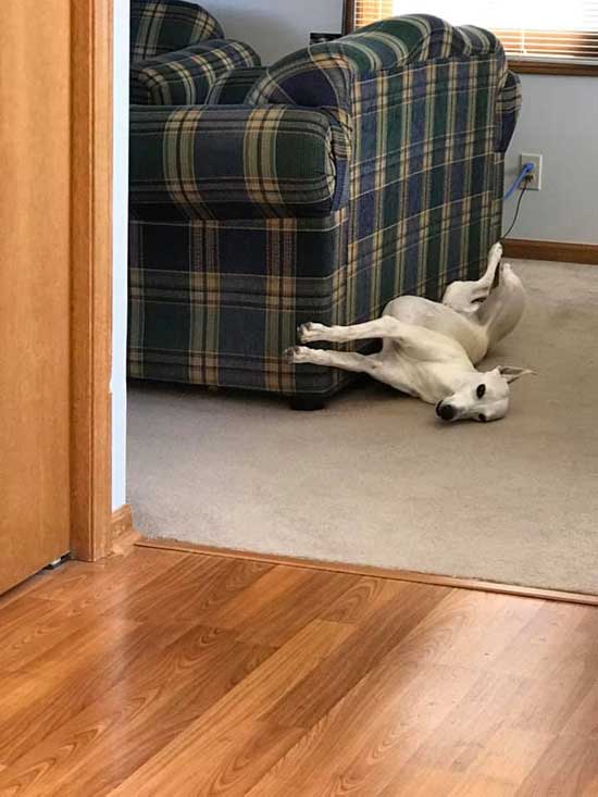 Safe, chez Moot. Peggy Pick - Sheltering at Home If it weren’t for the pandemic, the federal government’s pathetically inept delayed response, huge numbers of deaths, & the thought of dying on a gurney in a crowded hospital corridor, sheltering at home has been enjoyable and relaxing. We’re both working from home; Eric cooks every night; we walk the dogs. It has been really nice except for the tragic loss of life and impending doom part. Since I’m not going to exercise class, I do aerobic exercise or yoga every morning in the piano room. The aerobic exercise consists of dancing around to aerobics music for 30 minutes. Tiegan and Miles look at each other and I can almost hear them saying, “Whatever,” before they wander off. On yoga days, Miles is sure I’m lying on the floor in a twist, bridge pose, or downward facing dog just so I can give him attention. He comes over while I’m in the middle of a twist pose and thumps my outstretched arm. I rub his tummy and his chest. If I stop, he looks at me and if I don’t resume, he thumps me again. Tiegan would daintily tap, Miles thumps. Then he moves slowly so I can scratch between his shoulders, along his back, at the base of his tail and then back to his shoulders. “Don’t step on Mommy’s hair.” In bridge pose I extend one hand to rug his tummy. In downward dog, I try to explain this is really not convenient, but found I can rub his back with one foot. After exercise, or in Miles mind, his morning massage, I get ready to go to work, as in down the hall to my office. Eric’ office is in the basement and mine is on the second floor. After lunch we take Tiegan and Miles for a walk and go back to work. I feel extremely fortunate and very blessed. Eric and I like being at home with the babies, and we have a nice little home, back porch, and back yard in which to spend time. We can also take Tiegan and Miles for walks around our quiet neighborhood, wave at neighbors, and admire spring flowers. Tiegan and Miles hunted Easter Eggs in the back yard last week, and the Easter Bunny came down our street on a fire truck so we could all sit on our porches and wave. People put teddy bears and hearts in their windows so children could watch for them on their walks around the neighborhood. Sheltering at home in our small village is an easy task. Tiegan and Miles are so delighted we are home all the time. Even if they are sleeping, we should be here to watch them sleep. We take them for walks twice a day, and we are here for their convenience. If Tiegan wants something, she comes into my office and issues two small urgent whimpers which cause me to jump up and say “What’s wrong? Show me,” as I follow her down the stairs. The crisis usually falls into one of the following categories: 1) She is starving and will die if I do not give her sustenance, and then how will I explain this deplorable negligence to our baby sitter, vet, and neighbors? 2)There’s a squirrel that will not come down from a tree, and she wants the squirrel. This is an emergency, and I should do something. 3)There’s a dog walking down her street and she wants to go out immediately to make sure there was no unauthorized peeing in her yard. The nerve! In this instance, the urgent visit to my office is preceded by Tiegan and Miles running circles through the house and jumping on and off the couch to see if the invaders are still within sight. Miles also needs my attention throughout the day. He comes for lovies –a version of TLC –and after I give proper snuggles and praise, he is content to either nap in a cave bed or sleep on the futon bed in my office. There have been a few days of such exquisite spring weather that I spent most of the day on the back porch, laptop on the breakfast table, while Miles slept on a rug next to my chair. Tiegan frequently lies on her chair on the porch, watching for squirrels. Occasionally the calm is broken by the snap of the doggy door as they race out to pursue the squirrels who live in our back yard and taunt my puppies by running along the fence or jumping from tree to tree. It’s most exasperating when the squirrels are in the pine trees behind the fence. Tiegan and Miles see the squirrels, but can’t even stalk them under the trees. Our back porch is a lovely place to be. The birds sing all day and there’s usually a breeze. We have so many trees in the back yard that it’s much cooler here, even in the summer when the ceiling fan fills in for the breeze on close still days. I actually look forward to this month of staying home. Although, again, the cost for this respite is far too great, the death toll appallingly high. I feel as though the wolf could be roaming nearby and we would have no idea how close the threat is, because this threat is invisible. We are in our safe little enclave, with all sorts of comforts, while this disease ravages the country. A country that had plenty of warning and yet is so ill equipped to deal with this catastrophe. I am reminded of Poe’s The Masque of the Red Death: The disease walks among us.