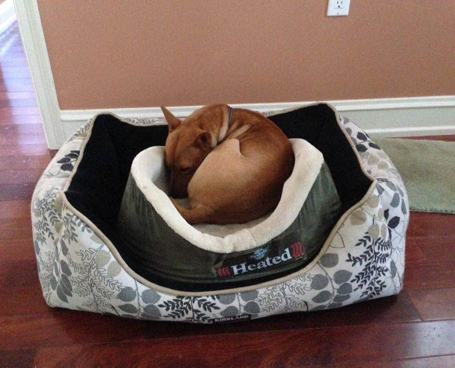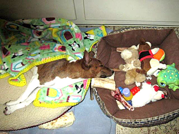 Bella Fuller, a little rescued rat terrier, has lots of mats and beds to choose from in different rooms. However, her favorite is Veronica's bed.