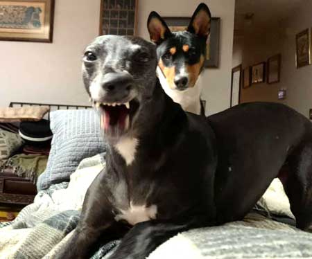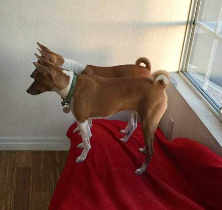 | Natalie Culver Late night “fun & games” hunter&huntress Jasper & Ivy. I was enjoying the breed pages in the AKC Gazette magazine (and nice pic Susan Kamen Marsicano & Goldie and fun quote fun Karen Christensen & other basenji fanciers.) looking at this with Hannah who was up well past her bedtime with me. When... I realized Jasper & Ivy had been outside ~5 mins when they usually do their late late night potty in 30 seconds or less. I was momentarily worried, thinking maybe they had somehow gotten out of yard and worrying about coyotes this time of year, until I spotted them in the yard and realized they were not in danger, they were just very busy enjoying their first kill! I didn’t see the deed but have to assume Ivy. Good dogs!! ? but... Dumb bunny... wish it had the smarts not to try to live inside the dog yard. I was able to lure Jasper away with some salami, meanwhile I was calling to Ivy and tossing her bits of salami. She looked at me like I was a crazy person to think she’d leave her prize for a bit of salami lol. We did this several times. Me tossing salami to her, hoping to get her away from dead rabbit; her grabbing salami, racing back to rabbit & tossing it in the air again. Oh boy, what a sight. She was having a grand time and also getting salami treats lol. I eventually got Ivy to come to me for a whole hotdog. But man was she pissed at me when I leashed her & pulled her away from “her kill” and locked her inside. She was screaming at me!