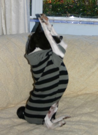 This has been a traumatic couple of months, capped by the fire. One of our latest little gals is a very scared black and white 3 1⁄2 year old who ended up in a shelter because her human dad is dying. Realizing Kooshy was insecure enough to bite any potential adopters, the local police department contacted us about her since they would only release her to rescue. Chuck was able to take off at 4am the day after the call and drive about four hours each way to pick up one very scared Kooshy. Although we have a come-a-long (the pole with a noose at one end that can be tightened), we have never used it but since Kooshy arrived with no leash and bounded out of her crate when the gate was open, we faced the choice of continuing to scare one very terrified dog or simply dropping the come-a-long quietly over her neck. Even this took time but I finally got her looped and we slipped a light chain leash on her collar, allowing her to be in her crate but also allowing us to handle her from three feet away, a distance that makes them feel so safe. I sat in the dirt with Kooshy convincing her that even her threats of biting were not working and that my hands were really good when allowed to rub tense necks and heads. Amazing how quickly some understand and begin to trust. By her third trip out with me, Kooshy was no longer threatening bodily harm and even let me pull her over to me. Sitting on my lap in a chair is also a pleasure for her, and she is now showing a very playful side. After all these years of bringing in rescue basenjis with various health and emotional issues, we would have to say that Kooshy must have been abused as we have never seen one of our kidlets so terrified of people who hadn’t been mistreated in a previous situation.