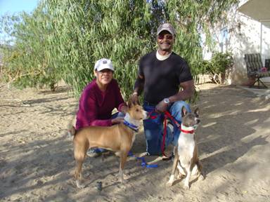 Meet Hababi (red male) and Sadie with their new people. Hababi had been placed by us into a family with a teen age son and two other dogs, a situation that did not work out as Hababi had some issues when he was returned. He spent some time with us mellowing out and was spotted by this couple who actually came to adopt a mix after having lost their Basenji. “Cool”, as the new dad is called, is really cool and so great with Basenjis. He had seen pictures of Sadie, the brindle gal, and wondered if Hababi and Sadie could be a pair. Hababi is totally in love with his new dad and sis and is being a perfect gentleman. Time, consistency, and love really can do wonders and finding the perfect home for a dog that could have been deemed unadoptable is one of the great rewards for all the time and work that goes into rescue.