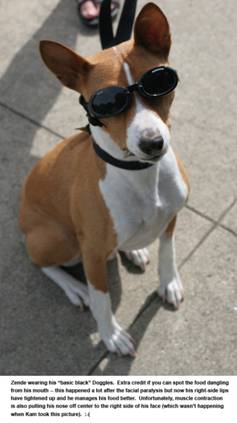 This is one of our special kidlets, rescued from Orange County Shelter years ago. He was going to be killed since he had been labeled “vicious”. On the day he was available, I had to work, so Chuck and one of our female adopters drove down figuring that, like some basenjis with problems, he might be more comfy with one gender over the other, so we covered our bases. Although Zende was difficult for new people to get to know, we had no problems with him and in fact, he was a charmer and settled down well enough to be adopted by a couple who had never owned a basenji before. After several years Zende got returned since they planned on having two footed kids and Zende would not be a childproof dog. A wonderful couple from northern California who have had several basenjis came to adopt and met Zende. Immediately Zende bonded to the guy, and off he went. About six months after his adoption, Zende went suddenly blind, one of those idiopathic things. Being a very intelligent little guy, Zende quickly learned a vocabulary that guided him on a leash. Once again Zende has had an idiopathic illness that has caused the muscles on one side of his mouth to tighten but again he is undaunted by what has been dealt him. When his people come to southern California to visit relatives, we get the pleasure of Zende’s company so we have gotten to keep enjoying him over and over. Zende always greets us with enthusiastic tail wags and has no problem letting us put on the goggles that protect his eyes from dust and low tree branches. This little guy will always have a very special place in our hearts. He really is a champion without ribbons.