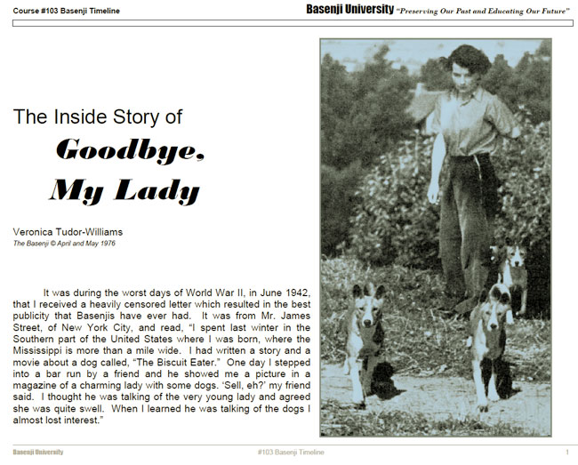 This article was written in March 1960 and first published in the inaugural issue of the Basenji Club of Great Britain’s Chronicle in 1963, and reprinted in the June 2004 issue of that magazine. It is reprinted with permission of the Basenji Club of Great Britain, and was reprinted in the February 2006 Wrinkler with the kind collaboration of Peter Morant, then editor of the Western Yodel. Veronica Tudor-Williams was a doyenne of the breed and President of the BCOGB, the world’s oldest Basenji Club, from 1960 to 1987. She died in 1989. She wrote: Before I left for the South Sudan I was often asked “what we would do about the dogs’ names, and whether we would be able to get any pedigrees. I was almost as uncertain about this as my questioners, except that I remembered that Mr. Arthur Byron bought a very young puppy in the South Sudan many years ago, and when he asked her name, the reply was instantly given “Amatangazig”. When Mr. Byron asked for a translation, all he got was a bawdy laugh, and he enquired no further. When out in the Sudan I learnt that Amatangazig has an anatomical meaning not at all suitable for polite society. It is a Zande word, and I was always getting into trouble, I would say a dog looked “just like Amatangazig” and would be hushed by my companions because the Zandes knew its meaning. Among the Zandes the first thing asked would be our names, then we would ask their names; next our tribe would be given as “Englezi”, we of course, knowing their tribe as Zande. Next we would ask the names of their dogs, and the answers would be given just as readily. The amusing part was, the dogs were nearly always named after the deficiencies of either husband or wife. One dog was called “Litta”, the loose man of the village, and another was called Nguaguru, “the Big Stick”, so one can imagine the jolly partnership. This remark though is really rather unfair, as the Zandes are a clean, gentle and kindly people, known as the “Gentle Savages” and I think the dogs’ names just show their nice sense of humour. When I purchased Fula, she was the only puppy we ever saw wearing a collar. She had a brightly coloured strip of native cloth tied around her neck in a bow, and a most engaging little scrap she looked, weighing about 3 lbs [1.4 kg] at about 7 weeks old. When I asked her price, this was quoted to me as “including the collar”. I immediately bought her, and the collar, and about a hundred fleas into the bargain. I asked her name, which I wrote on the back of an envelope, still in my possession. This was Fula, meaning a cork, I spelt it Foula, and was instantly corrected. Her breeder was a beaming black Zande, only too delighted to give his name, Sayed Ruge. Rather doubtfully I asked the names of Fula’s parents, and without hesitation I was told “Bobi” was her father and “Danakide” her mother. These names were given as quickly as if I had asked the names of Sayed Ruge’s own parents. Then I asked Habukukk, our interpreter, for translations and this was where the hesitation came. He told me that he could not translate Bobi, and looked rather embarrassed. I jumped to conclusions and said “Oh yes, like a pet name, which has no translation”, and he seemed very relieved. I have since decided that Bobi was probably a very rude word, which a Zande gentleman could not repeat. I only wish I had thought of this at the time, and got my companions to investigate the matter when I was out of earshot. Fula’s mother was an easy name Danakide, “the one who broke it” though it would be fun to know just what she broke, and how far it strained the marriage partnership. The grandparents involved a little more thought, though we had not much time at our disposal, Fula only being produced just (as) we were about to load into the Land Rover. However, these proved to be: “Wese” meaning “smooth” possibly referring to coat, which is borne out by Fula, who has a particularly smooth fine coat; “Dogati”, meaning “Vain Trial”, one wonders what Zande justice was involved in this; “Kuabase”, meaning “Breaker of Swords” – could this be a great hunter, or only someone who was careless?; and “Avuru”, translated as “Even though”, which rather leaves one in the air. Then came the question of Fula’s age; we did not worry much, as we were all dog breeders and we could judge her as being around 6 – 8 weeks. Actually judging by her teeth 2 months later, she was all of 8 weeks, but was so tiny and fine- boned compared with English Basenji puppies, we underestimated her age. To her native owner her age was a mystery, he simply did not know, a circumstance we readily understood, as we had struck this before. Time means nothing to the natives of the Southern Sudan. Why should it, the sun rises, and the sun sets, just the same each day, so why should days matter? The only big events are the Big Rains and the Big Droughts, but even time is difficult to tell by this. As far as we are concerned, Fula was acquired on May 12th, 1959, so she is registered at the English Kennel Club as born March 1959, a month which is bound to cover her birth. When I look at her, I often wonder what her thoughts would be if she remembered her native village, and how she left obscurity in the Southern Sudan to be a pampered pet in England. Maybe she would prefer the sunshine and the freedom, but knowing her, I suspect she likes her comforts and has her eye on future fame. Comments by Doreen DuffinMakuba Basenjis, Melbourne, Victoria, Australia Fula was lovely type. Admittedly she was rather elderly when I saw her, but she still was the lightly built, finely boned, high on leg, aristocratic looking dog that the Standard calls for. She had a good length of neck that flowed beautifully into her shoulders, and she had elegance, which is lacking in so many Basenjis. She was definitely true Basenji type. She wasn't tall, but I'd say within Standard. Her head was goo