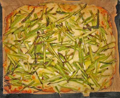 Remove from the oven and spread the béchamel on the surface. Decorate with the mozzarella and then with the asparagus drained from the dressing.