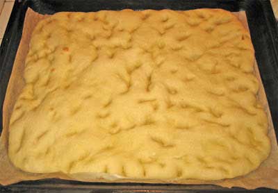 Mix the flour with baking powder, sugar and lukewarm water with the mixer. Add salt and only after the oil. Knead at low speed until a soft but elastic dough is obtained. Let rise in an airtight box for 1h and 20 minutes. Tracorso this time line a baking sheet baking paper, transfer the dough and angendovi hands gently spread over the entire surface. Cover with a sheet of film and let rise again for 30 minutes.