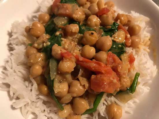 Heat the oil in a medium skillet over medium-low heat. Add the onions, season with salt and pepper and cook until the onions are dark brown and caramelized, about 10 minutes. Stir in the curry powder and garlic and cook for 30 seconds. Pour in the vegetable stock and stir to scrape up all the brown bits in the pan. Add the chickpeas, coconut milk, honey and a squirt of sriracha. Bring to a boil, reduce the heat and simmer for 10 minutes. Taste and adjust the seasoning.