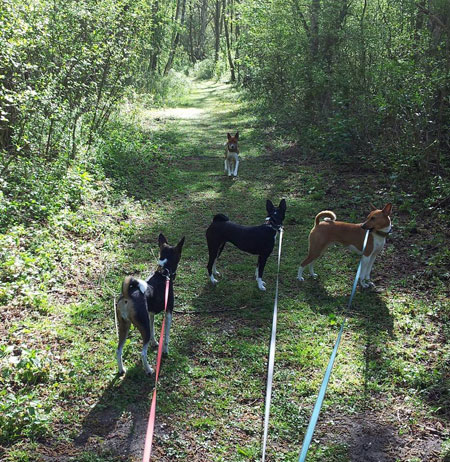 Jackie Dering Calves liver Harley likes it not Rob Chodock A boy and his dog. . . Hudson & Beck. Wendy Cerilli Scarlet makes a "strangulated belch", referring to the chortles Scarlet makes during her turns, in agility class, like in the weaves. Mary Beth Printsky Caesar can be sound asleep on the couch, but if I ask him if he wants to go for a walk, he wakes up immediately, with jazz hands! S K-M There's this: my first basenji, Blush, say around 1976, in the lobby of a high rise on 57th, between 6th & 7th Ave, in Manhattan. All Tame Animals was interviewing her. They said, "Will she stay down?" I said, "Blush, down, stay." And I got into an elevator & left her there with them. I went up a few stories, did not dally much, and came back down. So, I said, "did she move?" "Only her ears," they laughed. Joe Stewart The Maddie Chronicles: Maddie informed me she had a "pressing" need at 0800 to visit the backyard. She had been snuggled across my chest in the "Big girl" bed. I let her out and about 5 minutes later the Bark Alarm was activated. The Woofinator had spotted the public water serviceman that was responding to our water alert alarm. Barkfest drew the rest of the pack from the house. There were two black sub-woofers, one floppy brindle tweeter on the hot tub, and four pointy eared dancers line dancing the fence line. The performance stopped when I popped the baby food jar lid. Maddie returned wagging her tail with a look what a good girl am I grin on her face. Chewing on leashes Yvonne 't Mannetje - He does it all the time, Moyo is from the Basenji Liberation Force. S K-M - Moyo's kids chew on their leashes, too. Tamara Allen - Tippy tries to jump up and take the leash from me. On Sunday she jumped up and tried to take Stellas leash from Dennis.