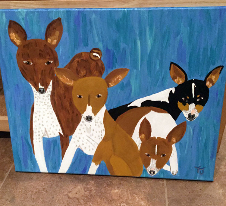 Karen Christensen I was lucky enough to have won a custom portrait in an auction - I got this, and a new friend!It is 16"X20". The painting is by Patricia Stroud Love. Patricia says, "I would be honored to do a commissioned piece for anyone interested. I love to paint and now that I'm retired, I have plenty of time to devote to it." To contact Patricia, find her on Facebook.IslandTop Designs tags. (828) 429-5322On Etsy.Basenji tag.