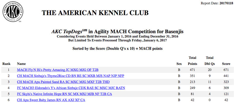 Top Agility Basenjis for 2016 Rip Van Wrinkle Club Members' Dogs. . . #1 for 2016 - MACH ZURI AND PAUL MOUNT. (MACH Fly'N Hi's Pretty Amazing JC MXG MJG OF T2B) #3 for 2016 - CH MACH FERN AND SUSAN MARSICANO. (CH MACH Apu Painted Sand RA SC MXC MJG #6 for 2016 - CH FIDDLE AND SUSAN MARSICANO. (CH Apu Sweet Baby James RN CA AX AXJ XF FCh ORC GRC MVB) AKC TopDogs in Agility MACH Competition for Basenjis for 2016 (6 Jan 17) AKC TopDogs in Agility PACH Competition for Basenjis for 2016 (15 Feb 17) Lifetime AKC TopDogs in Agility MACH Competition for Basenjis (6 Jan 17)