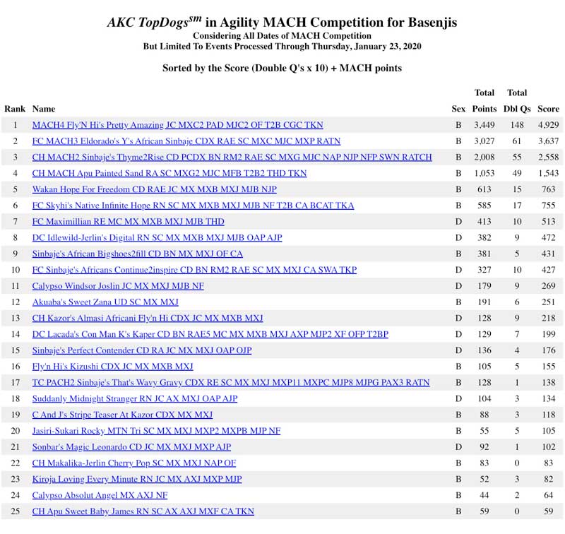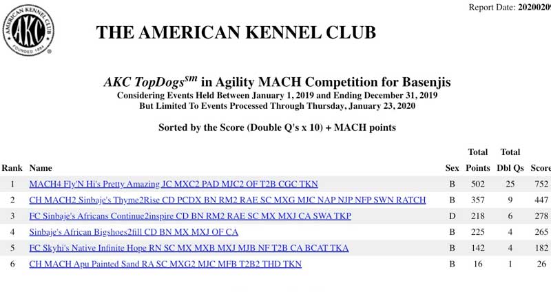 AKC TopDogs in Agility MACH Competition for Basenjis for 2019 RVW Dogs #s 1 & 5!